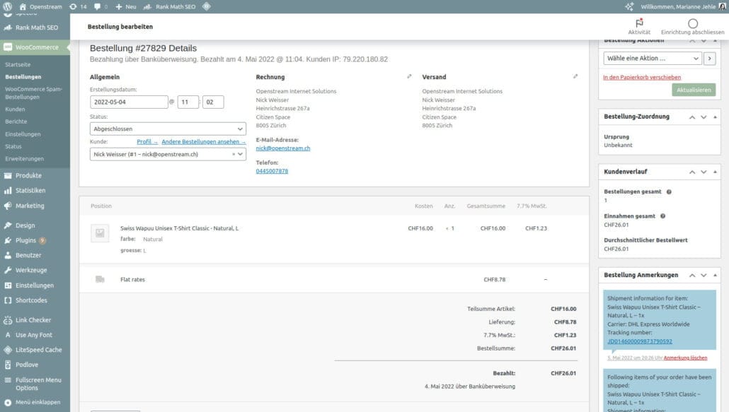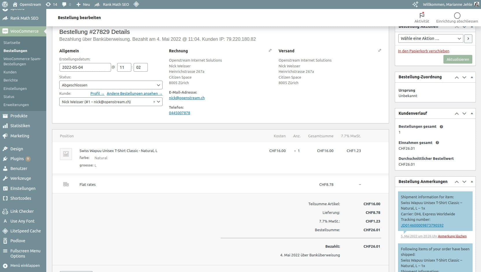 Die Abwicklung einer Bestellung ist in ebenfalls sehr intuitiv. Es können Nachrichten an Kunde gesendet oder interne Notizen erfasst werden. Bestellstatus können mit oder ohne Nachricht an Kunde gesetzt werden. Mit einer passenden Erweiterung kann z.B Bei Bestellabschluss eine Rechnungs-PDF mitgesendet werden.
