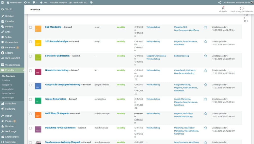 Die Produktübersicht ist sehr übersichtlich. Neben Artikelnummern und Preisen sind die Kategorien und Aktualisierungen aufgeführt.