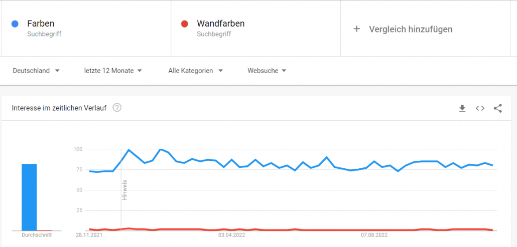 Ein Beispiel: eine Firma verkauft Farben zum Streichen von Wänden. Der Fachbegriff ist Wandfarbe und somit nutzt die Firma im Text auf der Webseite auch dieses Keyword. Die Auswertungen zeigen hier aber, dass das Schlagwort «Farben» von 80% der Nutzer in die Suchmaschine eingegeben wurde und nur ca. 1% der Nutzer nach Wandfarbe gesucht haben. Die Konsequenz ist, dass das Unternehmen einen Grossteil der potenziellen Kunden nicht erreicht bzw. die Seite bei der Suchanfrage für Farben nicht angezeigt wird.