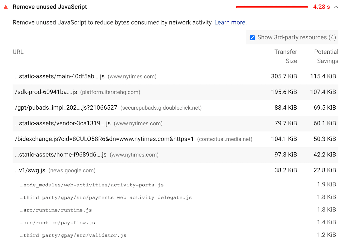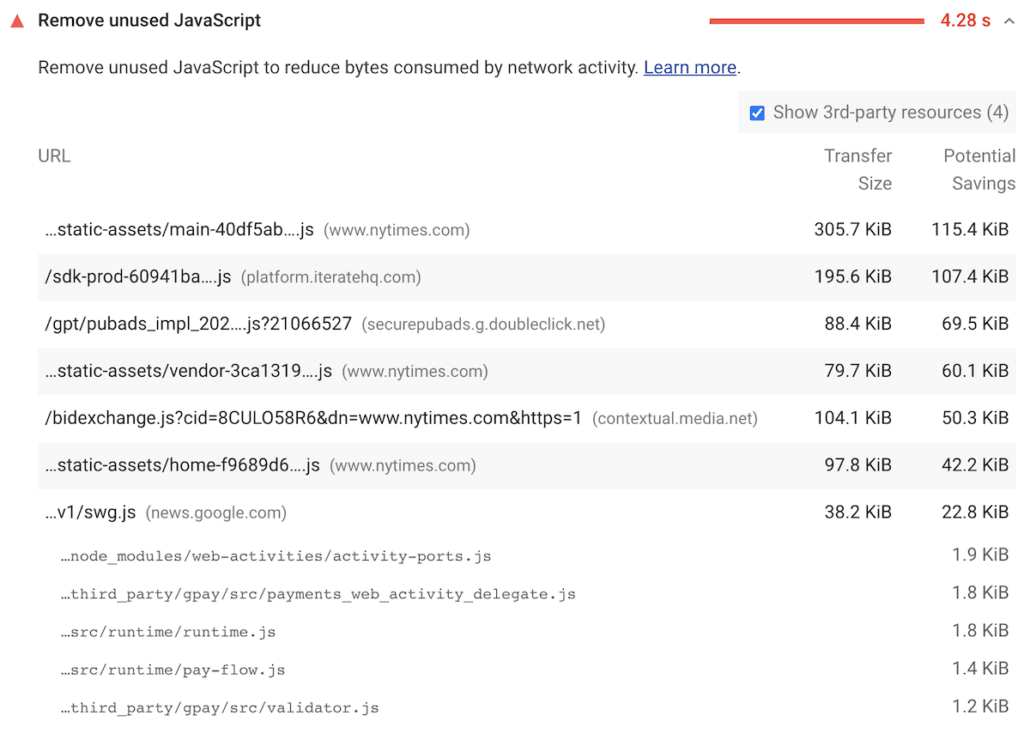 • unused-javascript is an audit that has been kicking around for some time but is only now turned on by default. It accounts for what JavaScript was loaded but never executed during page load and estimates the load time that could be saved via code splitting, dead code elimination, or judicious use of the delete key.