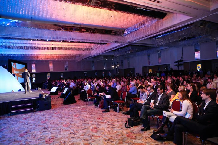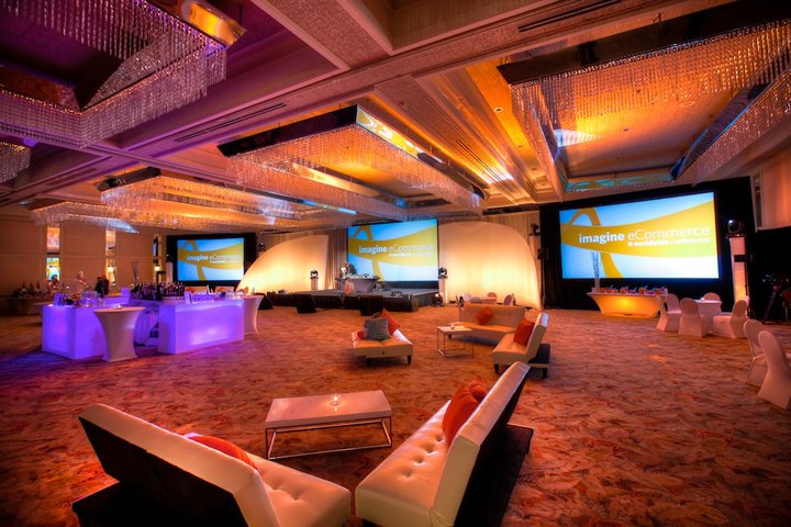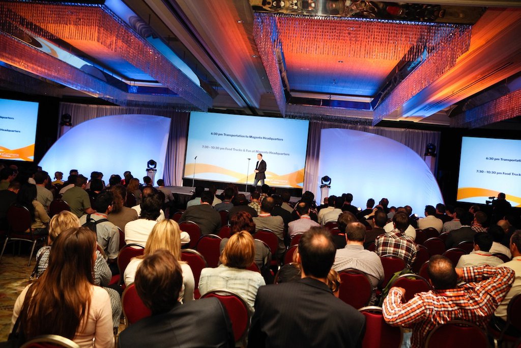 Am Montag Abend fand dann endlich der Opening Night Event im International Ballroom des Hilton Hotels statt, in welchem auch heute morgen die Keynotes von Bob Schwartz, Roy Rubin und Blake Nordstrom stattfanden. Die Aufmachung der Magento Imagine Konferenz war ganz nach dem amerikanischen Have-Fun-Motto, untermalt mit lauter Musik, Lichteffekten und viel Trara in einem ausverkauften Saal von 600 Besuchern und drei riesigen Leinwänden.
