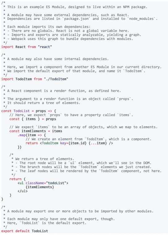 PWA Studio’s technology stack is centered around ES Modules, a standard for structuring JavaScript code as single-file modules that can import and export objects. The view library that’s been chosen, React, uses a component-oriented model that dovetails neatly with ES Modules: