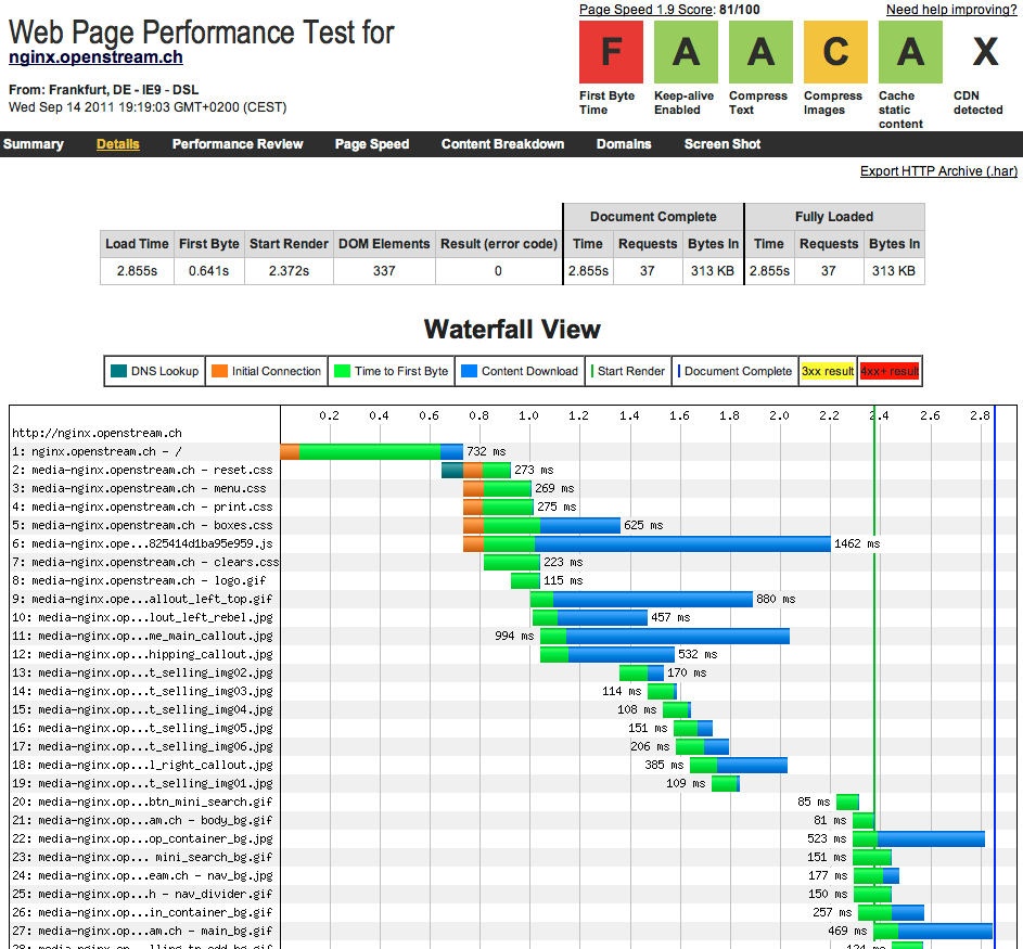 Abschliessend noch ein Test von webpagetest.org unseres Magento Nginx Demo Stores, welcher offenbar auch noch Optimierungspotential hätte aber zumindest beim wiederholten Aufruf dank Nginx unter einer Sekunde liegt 😉