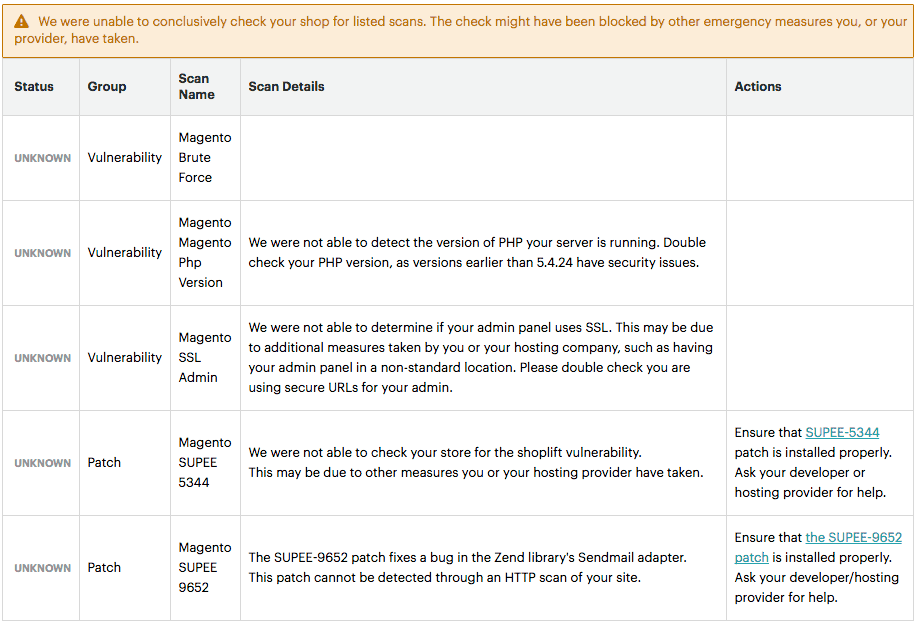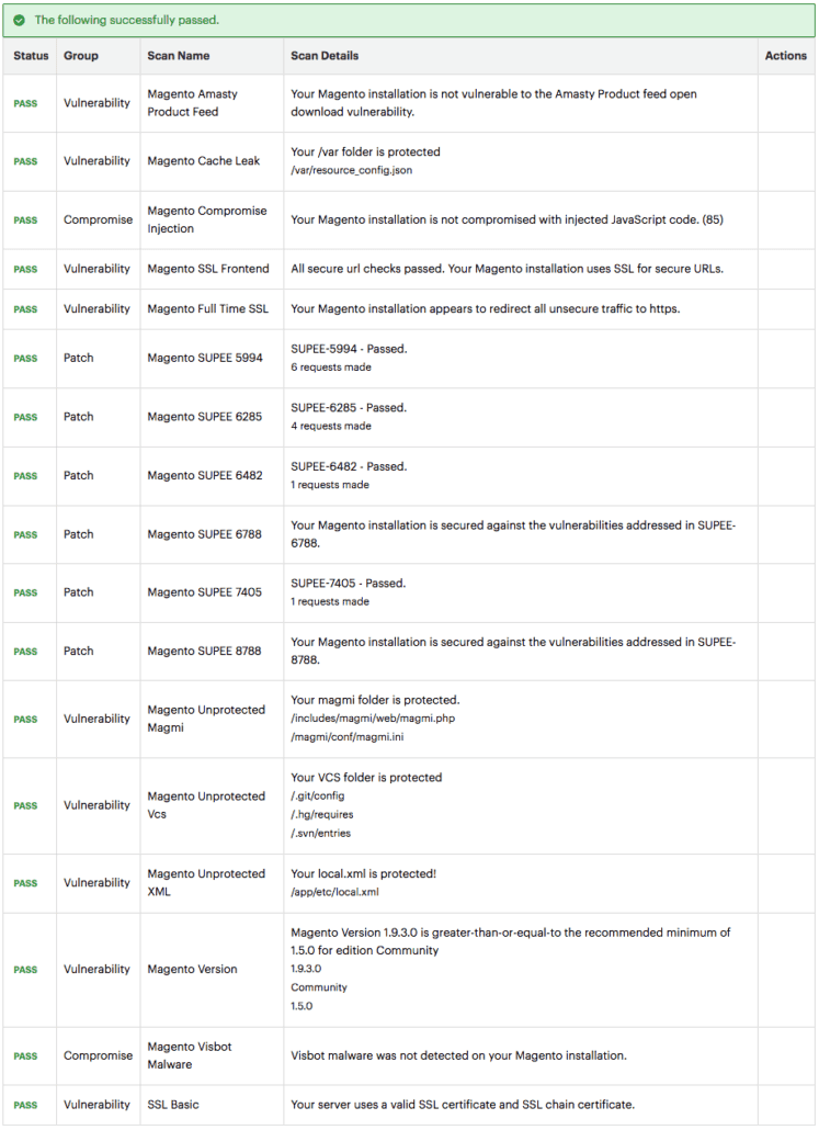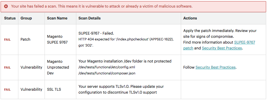 • Over 30 security tests to identify potential vulnerabilities, such as missing Magento patches, configuration issues, and failure to follow security best practices