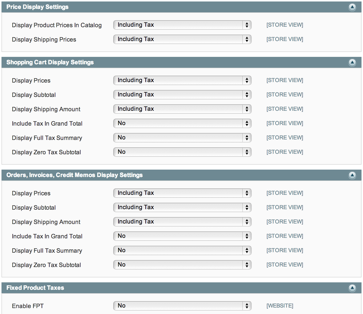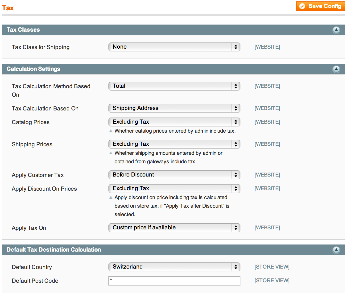 The second set of configurations is under System / Configuration / Sales / Tax. Although Magento lets you decide whether you want catalog prices to be entered in the backend including or excluding tax, for a B2C store excluding tax is the only viable option, because if you set this to including tax and enter all product prices as gross prices you will end up with VAT added on top of product prices which does not make sense.