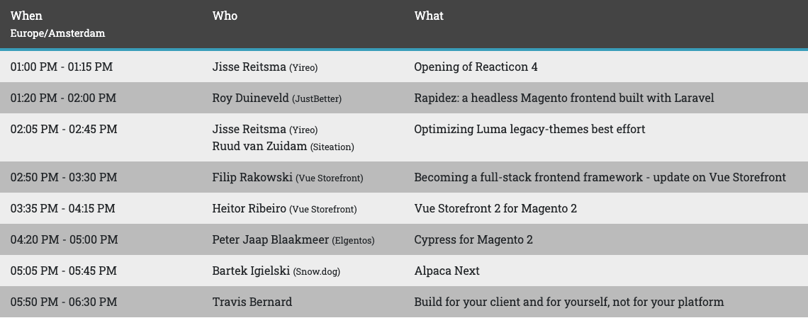 Although online conferences are never comparable to in person events, today I really felt the excitement about the new Magento frontend with the best developer experience and fastest time to market for merchants. Thanks Jisse and team for organizing another amazing event to bring together so many inspiring people from the Magento and Shopware communities. Although it might have been the last Reacticon, I’m sure that this wasn’t the last conference you organized.
