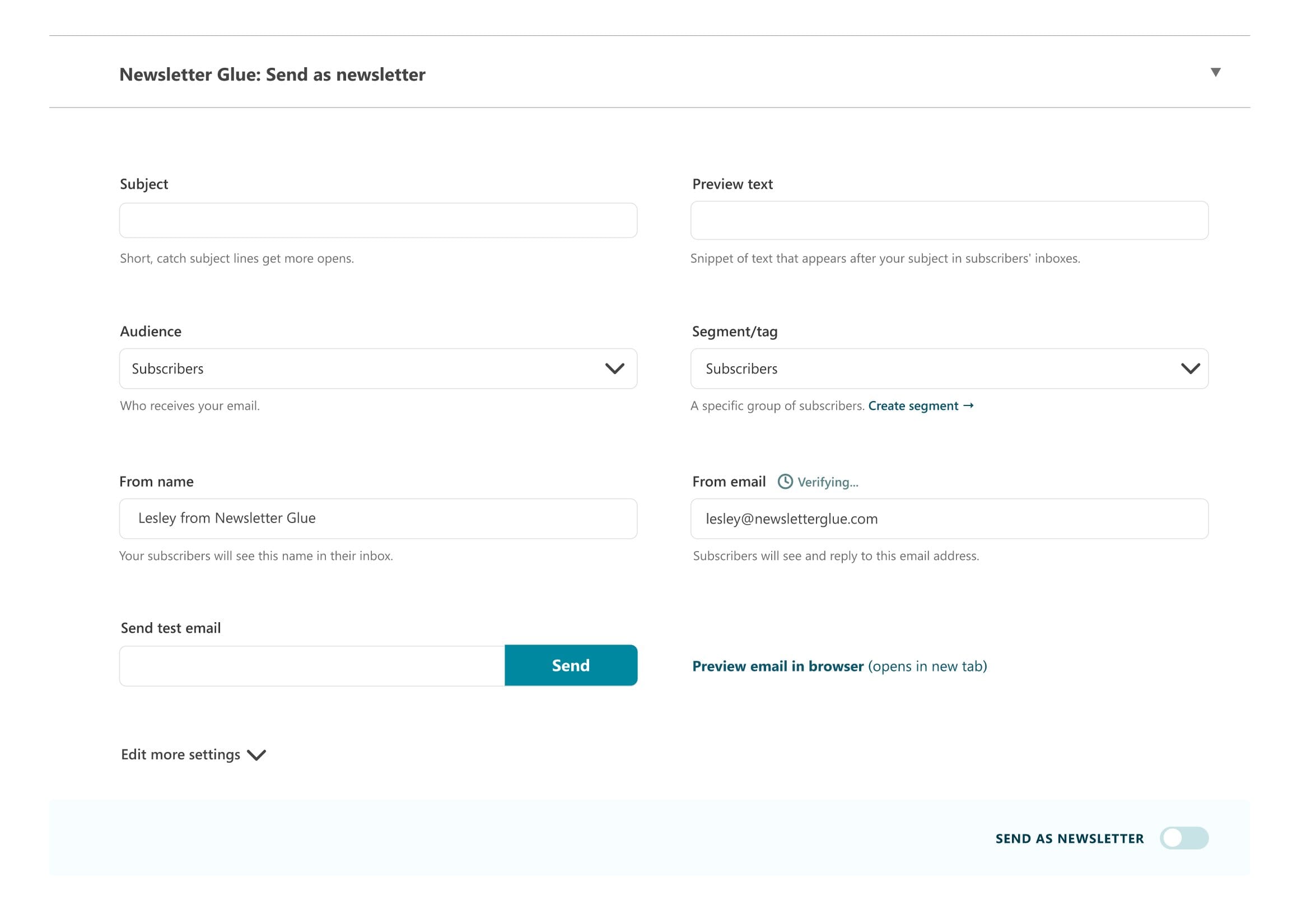 According to an announcement on Twitter, the next release of Newsletter Glue will probably ship next week with a cleaner and clearer publishing UI (user interface), because some users (myself included) had issues with saving a newsletter as a draft in Mailchimp.