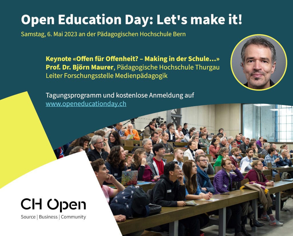 Der Open Education Day 2024 findet am Samstag, den 4. Mai 2024 an der Pädagogischen Hochschule in Bern statt. Die Tagung wird wieder einen Higher Education Track umfassen, welcher in englischer Sprache abgehalten wird. Unter dem Motto «open for all» wurde Jöran Muuß-Merholz als Keynote-Speaker eingeladen. Die Veranstalter freuen sich auf eure Beiträge beim Call for Sessions.