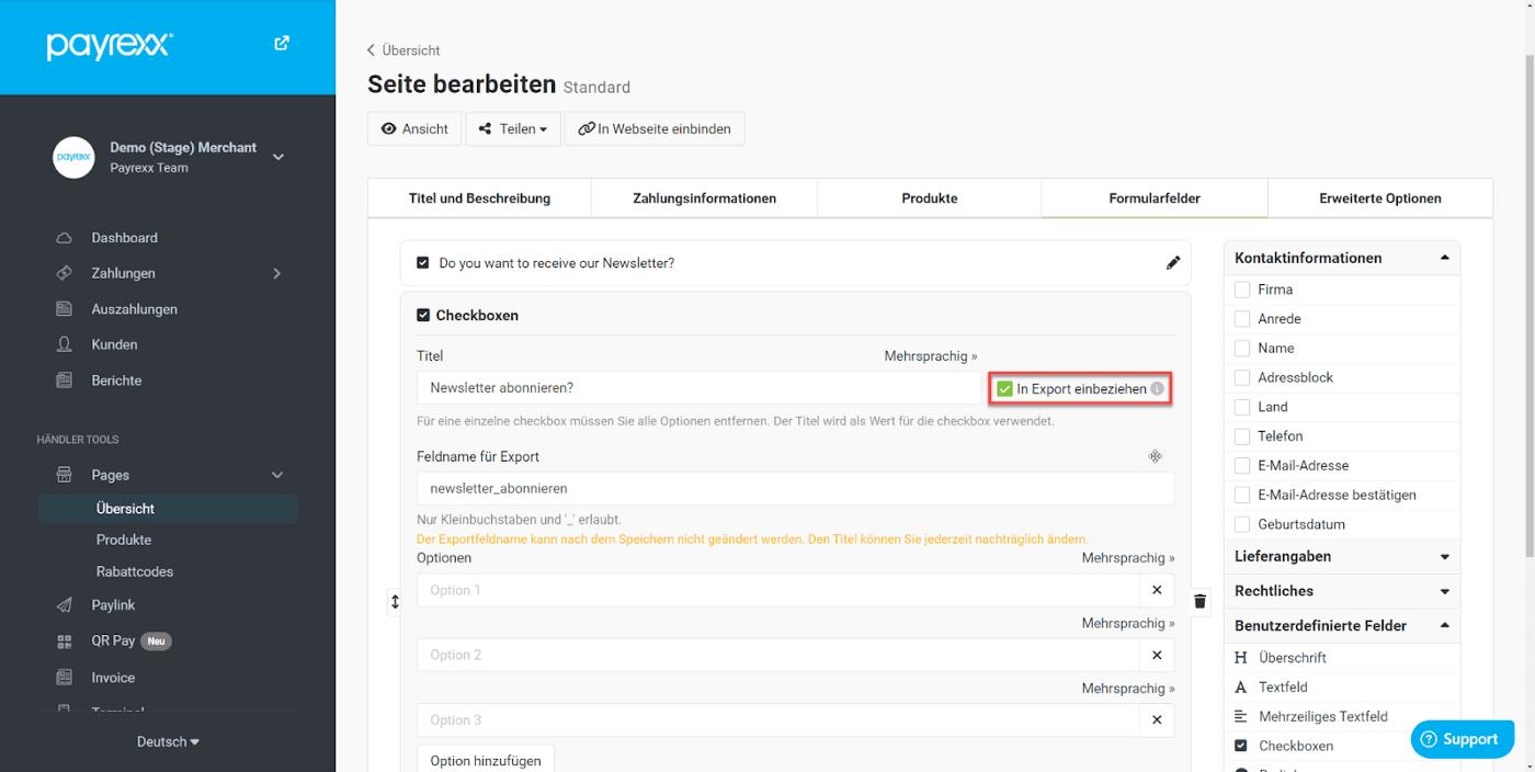 Händler:innen haben neu die Möglichkeit, benutzerdefinierte Felder wie “Newsletter abonnieren?” im «Pages» und «Donation» Tool für den Export zu wählen. Diese Exportfelder können dann bei einem Export unter «Benutzerdefinierte Export Felder» ausgewählt werden.