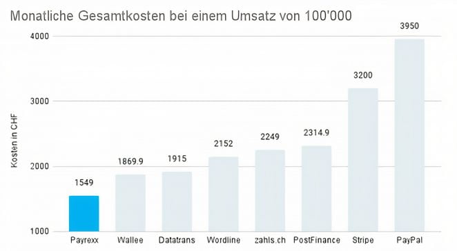 Die Kostenanalyse zeigt die monatlichen Gebühren für mittelgrosse Onlineshops mit einem Handelsumsatz von 100’000 CHF bei 1’000 Kreditkarten-Transaktionen pro Monat. Der durchschnittliche Wert einer Transaktion ergibt folglich 1’000 CHF.