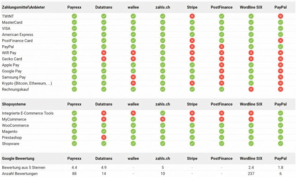 Datatrans, PayPal, Payrexx, PostFinance, Stripe, wallee 1, wallee 2, Worldline, zahls.ch.