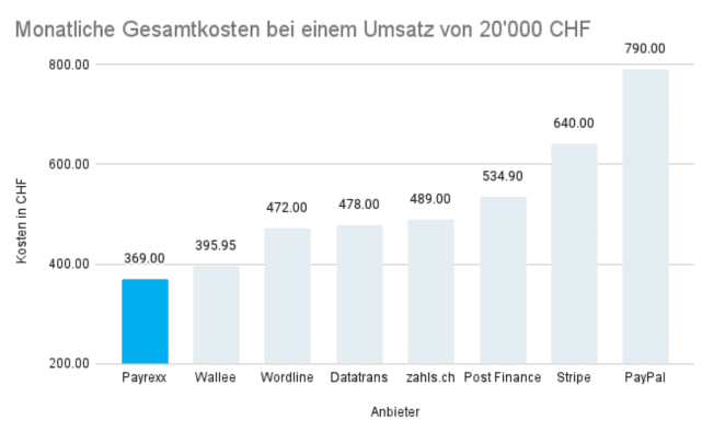 Die niedrigsten Gebühren hat man mit Payrexx, dicht gefolgt von wallee. Mit Kosten von 790 CHF ist PayPal für Onlineshops mit diesem Volumen am kostspieligsten. Der absolute Preisunterschied zwischen Payrexx und PayPal beträgt 421 CHF. Folglich sind die Kosten beim günstigsten Zahlungsanbieter Payrexx um mehr als 50 % niedriger als beim teuersten Angebot.
