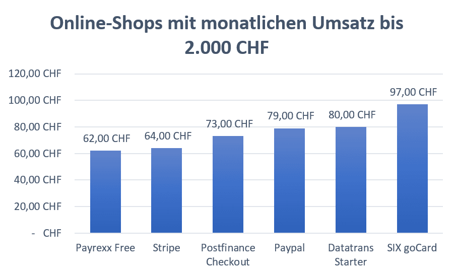 Die Kostenanalyse zeigt die monatlichen Gebühren für kleinere Onlineshops mit einem Handelsumsatz von 2’000 Franken bei 20 Kreditkarten-Transaktionen pro Monat.