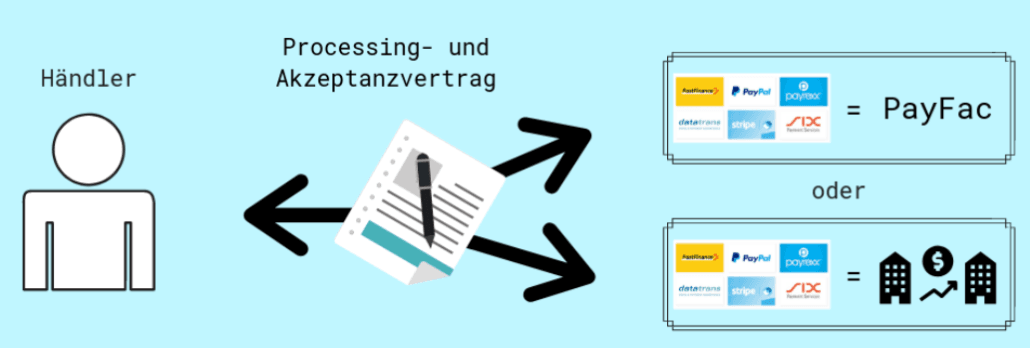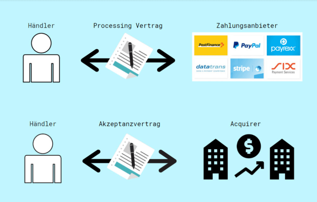 Um Zahlungen im Onlineshop zu akzeptieren, brauchen Händler einen Akzeptanzvertrag mit einem Acquirer und einen Processing Vertrag, der mit einem Zahlungsanbieter abgeschlossen wird.