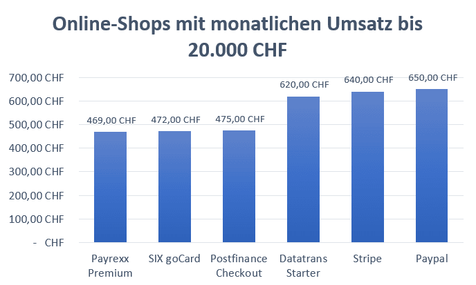 Die Kostenanalyse zeigt die monatlichen Gebühren für mittelgrosse Onlineshops mit einem Handelsumsatz von 20’000.- bei 200 Kreditkarten-Transaktionen pro Monat.