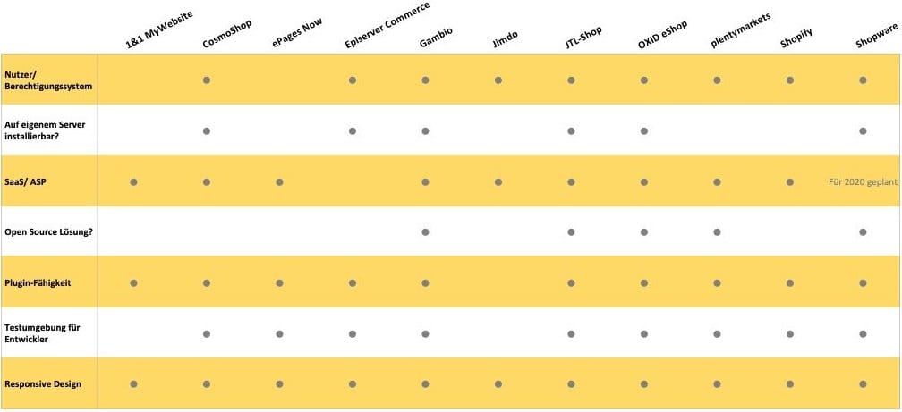 Es scheint sich bei diesem Shop System Vergleich nicht wirklich um eine repräsentative Marktübersicht zu handeln. Man müsste sie wohl eher einen Vergleich von vorwiegend deutschen Shop Systemen nennen. Die 179 Kriterien in 16 Kategorien sind aber sicherlich eine gute Grundlage sich Gedanken darüber zu machen, welche Anforderungen für die jeweiligen individuellen Bedürfnisse zu berücksichtigen sind.