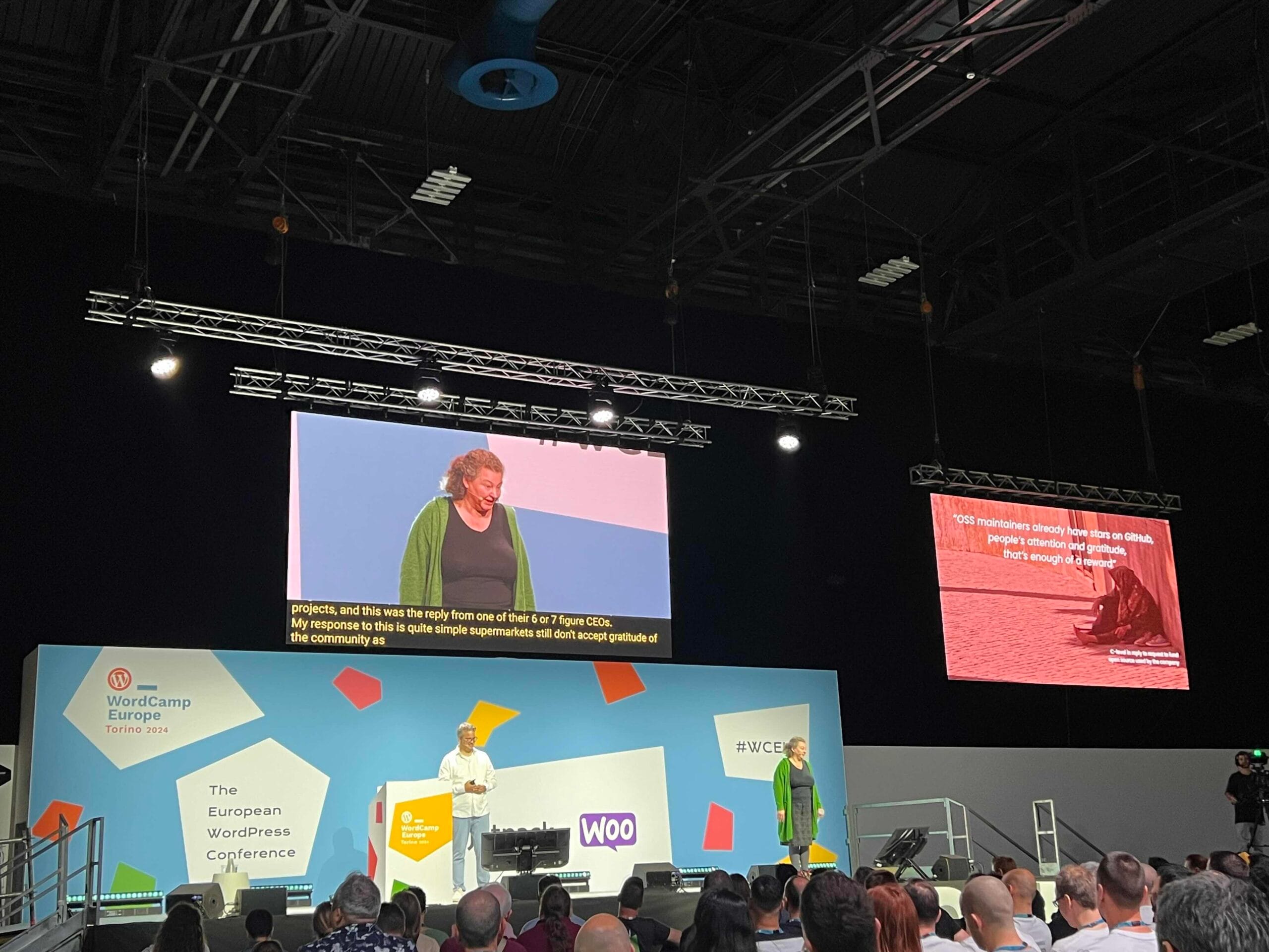 On the first day of WordCamp Europe 2024 Remkus de Vries introduced Juliette Reinders Folmer and Joost de Valk as influential figures in the WordPress and open source community. Juliette, known for her prolific contributions, and Joost, an investor in open source, were set to discuss open source sustainability.