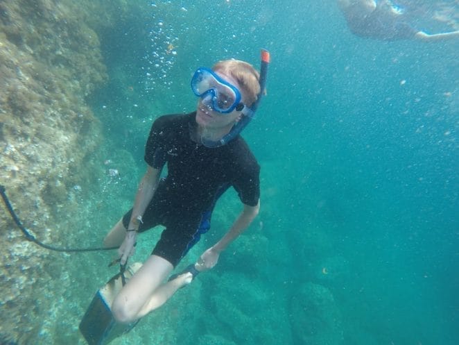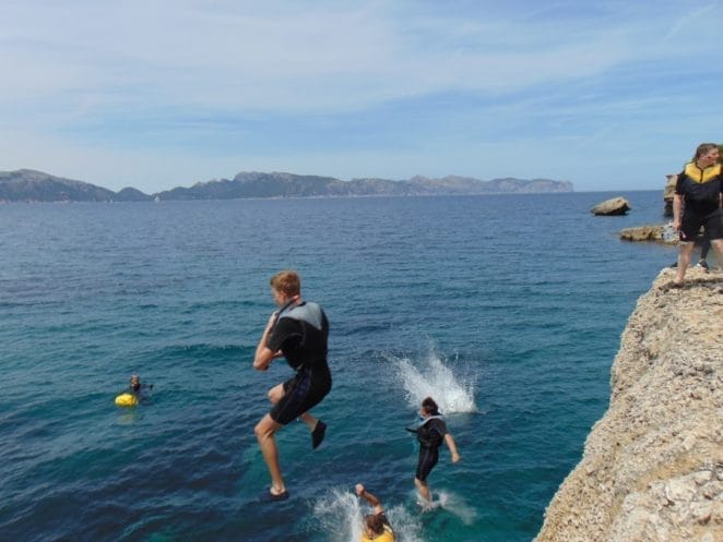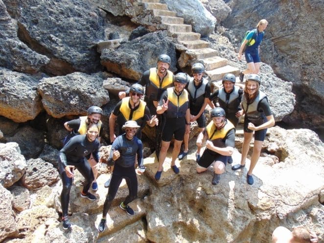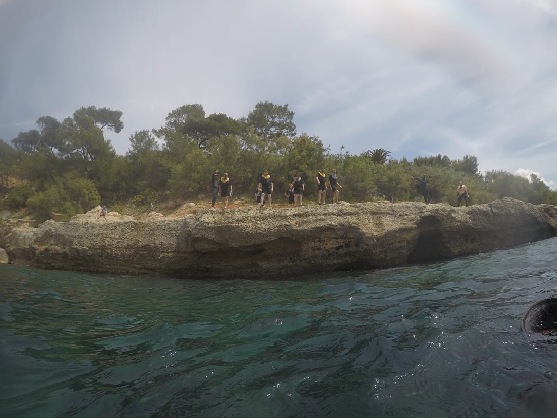 Dann stand «The Challenge» auf unserem Programm. Unser Abenteuer begann bereits mit der Abholung im coolen Jeep und einer noch cooleren Tourguide aus Argentinien. In einer malerischen Bucht angekommen, starteten wir in Kajaks um an unser erstes Ziel, der Wasserhöhle, zu kommen. Darin waren 4 Schlüssel zu finden, mit denen wir samt Schnorchelausrüstung, von den Klippen gesprungen sind (3-4 Meter über dem Meeresspiegel) um anschliessend schnorchelnd die Schatzkiste zu finden und zu bergen. 3 Tourguides sorgten dafür, dass alles wie am Schnürchen lief und tolle Fotos schossen sie noch dazu. Nick, Manuel und sein Sohn haben sogar noch ne Schippe drauf gelegt und sind von einer 8 Meter hohen Klippe gesprungen, unfassbar. Respekt!