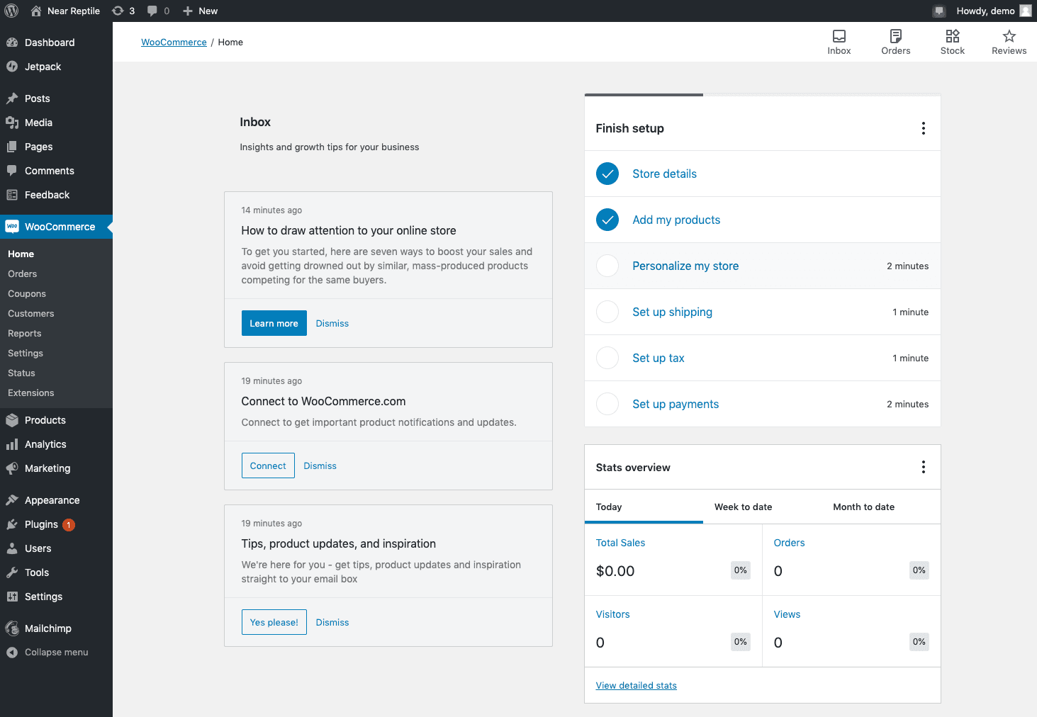 WooCommerce gets a completly new home page design that makes store management easier than ever. It includes following items:
