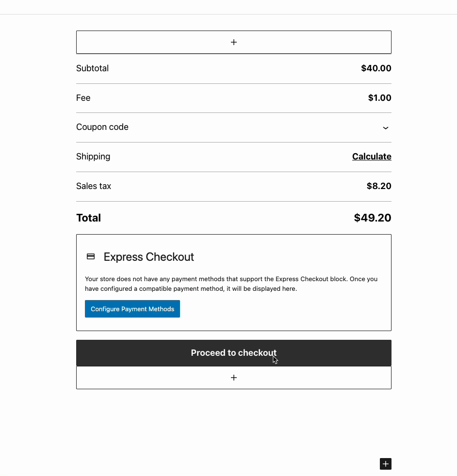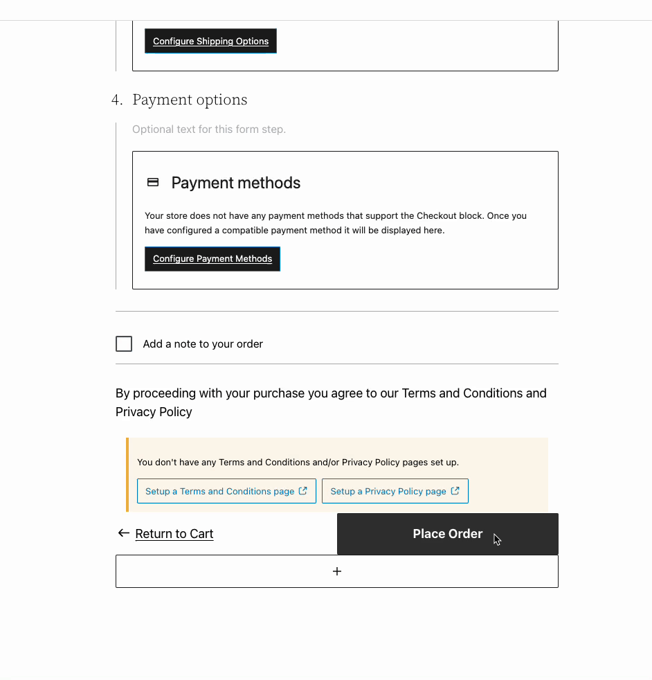 On the Cart Block, the “Proceed to Checkout” button text is now editable in the editor. On the Checkout block, the “Place Order” button text is also editable. These will default to the original text if left empty.