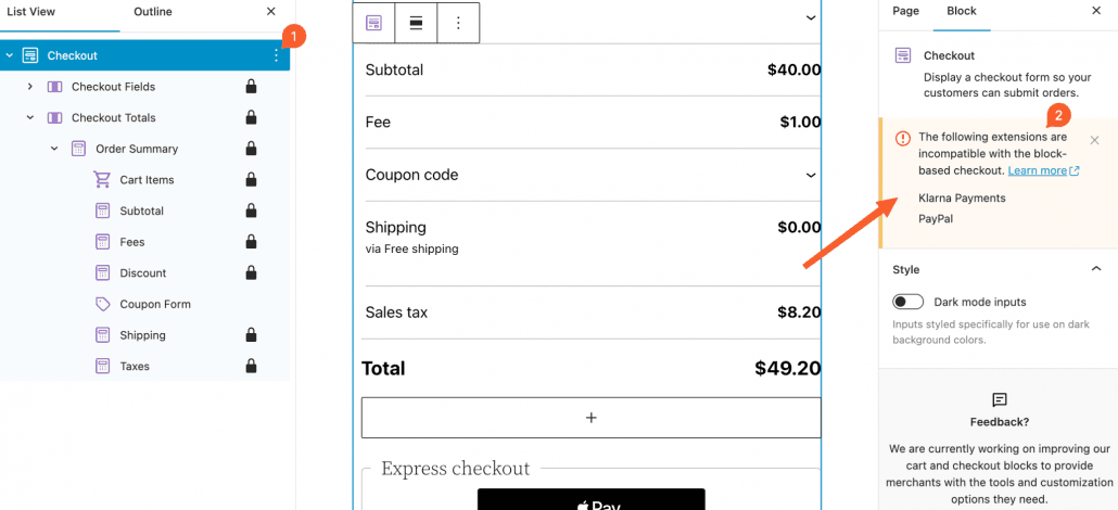 If you use any incompatible payment gateways, you will now get a warning notice in the editor side of the `Cart` & `Checkout` Blocks: