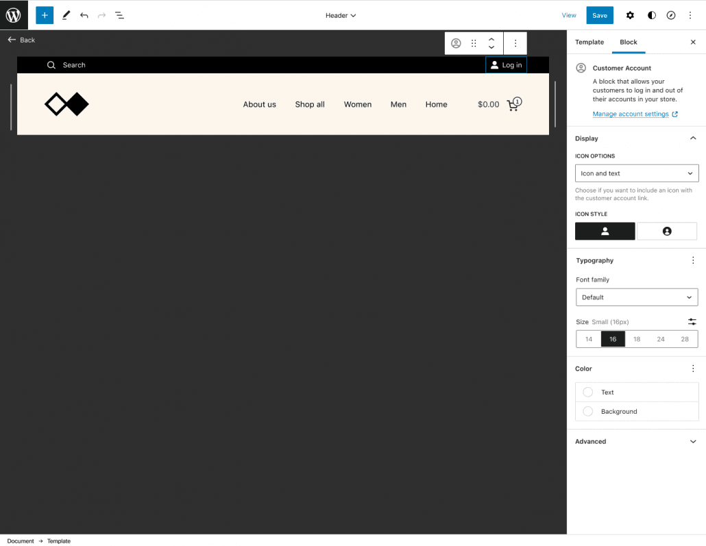 This block contains a link to the Login and My Account pages and was added to the Header and Footer patterns. It’s possible to customize this block to be displayed as text-only, icon-only, or icon and text. You can also select the icon style.