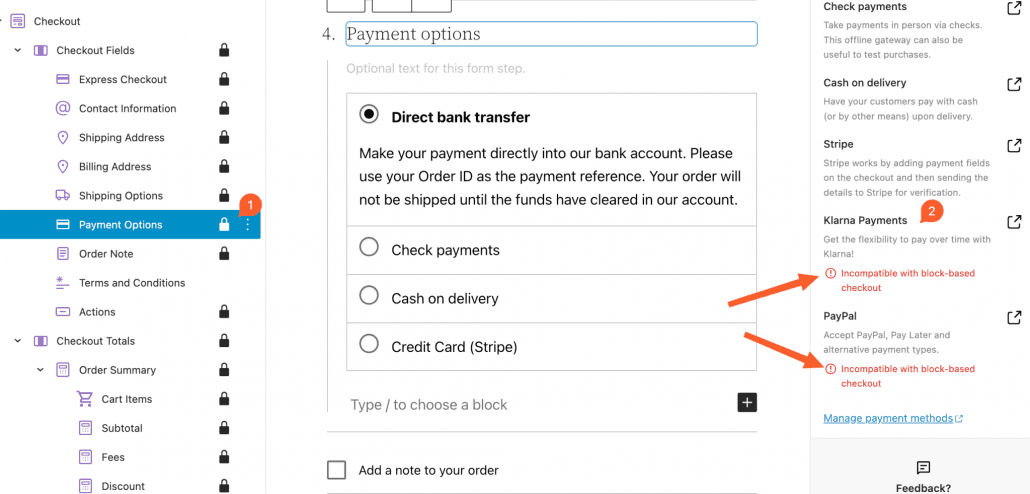In the `Payment Options` Inner Block of the `Checkout` Block, we also display a warning under incompatible payment gateways: