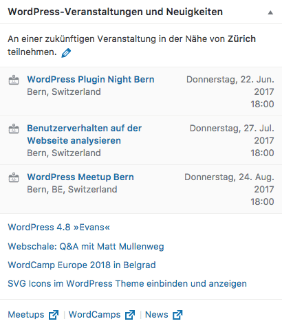 Wer nun Interesse an WordPress Veranstaltungen hat, kann sich die Termine von lokalen Meetups und WordCamps anzeigen lassen. Diese Neuerung könnte Neulinge auf hilfreiche Events aufmerksam machen, sowie die WordPress Community stärken.