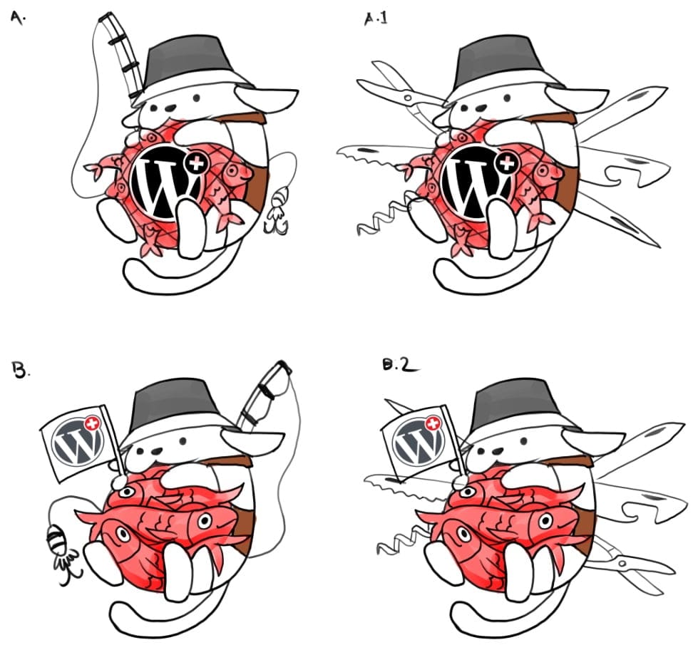 When we started organizing WordCamp Switzerland 2023, I volunteered to create a new conference Wapuu. Since it would be taking place at Lake Murten, we thought that it could be a fisher Wapuu holding a big fish. Then Michelle suggested that since it’s taking place on April 1st, it could be holding red herrings because in French you say Poisson d’Avril for April Fools› pranks.